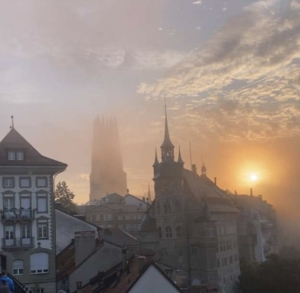 Winterstimmung über dem Rathaus und der Kathedrale Fribourg